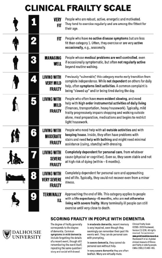 - Lee, L.; Heckman, G.; Molnar, F.J. Frailty. Can Fam Physician 2015, 61, 227–231. Available online: https://www.ncbi.nlm.nih.gov/pmc/articles/PMC4369632/ (accessed on 31 March 2025).