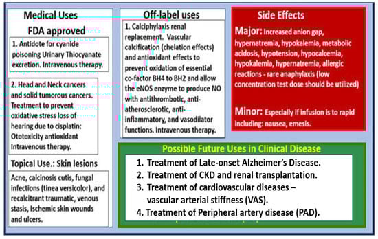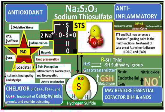 - Hayden, M.R.; Tyagi, N. Sodium Thiosulfate: An Innovative Multi-Target Repurposed Treatment Strategy for Late-Onset Alzheimer’s Disease. Pharmaceuticals 2024, 17, 1741. [Google Scholar] [CrossRef]