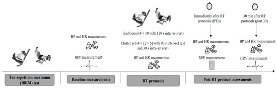 Schematic representation of the experimental design. Participants performed a ten-repetition maximum (10RM) test, followed by a pre-experiment assessment, which included blood pressure (BP), heart rate (HR), and heart rate variability (HRV) measurements. The resistance training (RT) protocol followed a randomized crossover design, incorporating both traditional and cluster set configurations. BP and HR were assessed during and immediately after exercise (IPEx). Ratings of perceived exertion (RPE) were assessed IPEx. Post-exercise assessments included BP, HR, and HRV measurements.