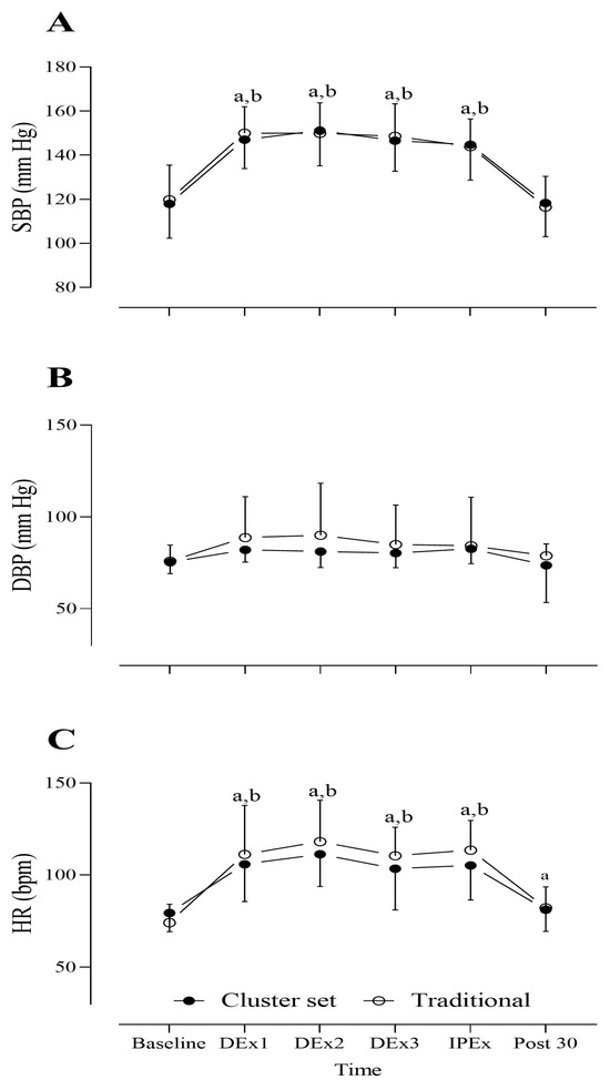 Data on (A) systolic blood pressure (SBP), (B) diastolic blood pressure (DBP), and (C) heart rate (HR) measured at baseline (before exercise), during exercise (DEx), immediately post-exercise (IPEx), and 30 min post-exercise (post 30) following resistance training (RT) protocols (traditional and cluster set). Values are expressed as mean ± standard deviation. Statistical significance was set at p < 0.05. The symbols “a” and “b” indicate significant differences from baseline values for the traditional and cluster set RT protocols, respectively. Bpm = beats per minute.