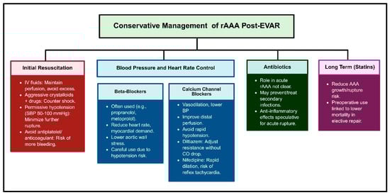 Patients with ruptured AAAs post-EVAR may present with symptoms similar to those of ruptured AAAs without prior EVAR, such as a sudden onset of severe abdominal or back pain, hypotension, and signs of shock. However, the presence of an endovascular graft can sometimes alter the clinical presentation such that the rupture may be contained for a longer period, potentially allowing more time for intervention [1]. The incidence and prevalence of mortality after rAAAs post-EVAR remain high, with studies indicating a perioperative mortality rate of approximately 24.5% for EVAR compared to 37.8% for open surgical repair [10]. Surgical intervention—endovascular or open—is the mainstay and the preferred treatment in suitable patients. Conservative management, as outlined in Figure 2, may be considered when a patient with an rAAA exhibits a stable haemodynamic status, showing no signs of severe shock or significant organ dysfunction. In such cases, immediate surgical/endovascular intervention may be delayed and in some circumstances withheld [22]. This is particularly so in patients who are not suitable candidates for surgical intervention due to high operative risk or the presence of comorbid conditions that outweigh the potential benefits of surgery [23]. Pharmacological management is essential, focusing on maintaining haemodynamic stability, reducing aortic wall stress, and preventing complications such as infections.