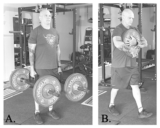 Farmer’s handle load carriage (load in both hands on the side of body) was completed in the first experimental visit. Farmer’s handles are basically barbells (Rogue Farmers Walk handles, Rogue Fitness, Columbus, OH, USA) with a handle in the middle of the bar for the participant to hold, and the load is adjusted by placing calibrated plates on the end of each farmer’s handle. When these implements are used in training, the farmer’s handles can be carried unilaterally in one hand or bilaterally in both hands with the arms hanging at the side. The participants in our study carried weight bilaterally on the farmer’s handles with equal weight (½ of the total load) in each hand. It has been reported that unilateral carriage is inherently riskier because it results in asymmetrical loading of the spine, hip, and increased bending of the lumbar region which leads to higher lateral forces and spinal compression [8,19]. Zercher load carriage (load in the crook of elbows in front of the body) was completed in the second experimental visit. Participants were instructed to carry the weight plate(s) in front of them as shown in Figure 1.
