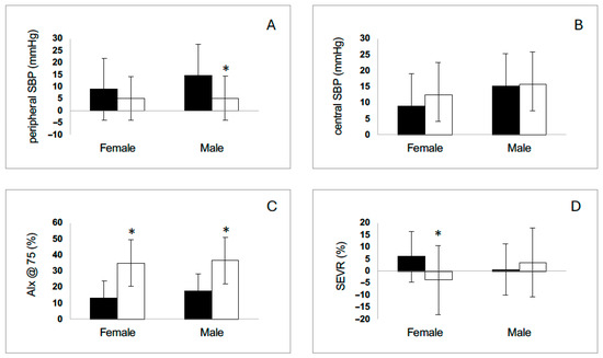 Change values (calculated difference from pre-carry to post-carry) in physiological measures with farmer’s handle (in solid black bars) and zercher (in open bars) carriage. * p < 0.05 between carriage type. Reporting change in (A) peripheral SBP, systolic blood pressure (Male: p = 0.02 between carry type, d = 0.68); (B) central SBP; (C) Aix@75, augmentation index at heart rate 75 (Female: p = 0.000 between carry type, d = 1.32; Male: p = 0.002 between carry type, d = 0.94); and (D) SEVR, subendocardial viability ratio (Female: p = 0.049 between carry type, d = 0.43).