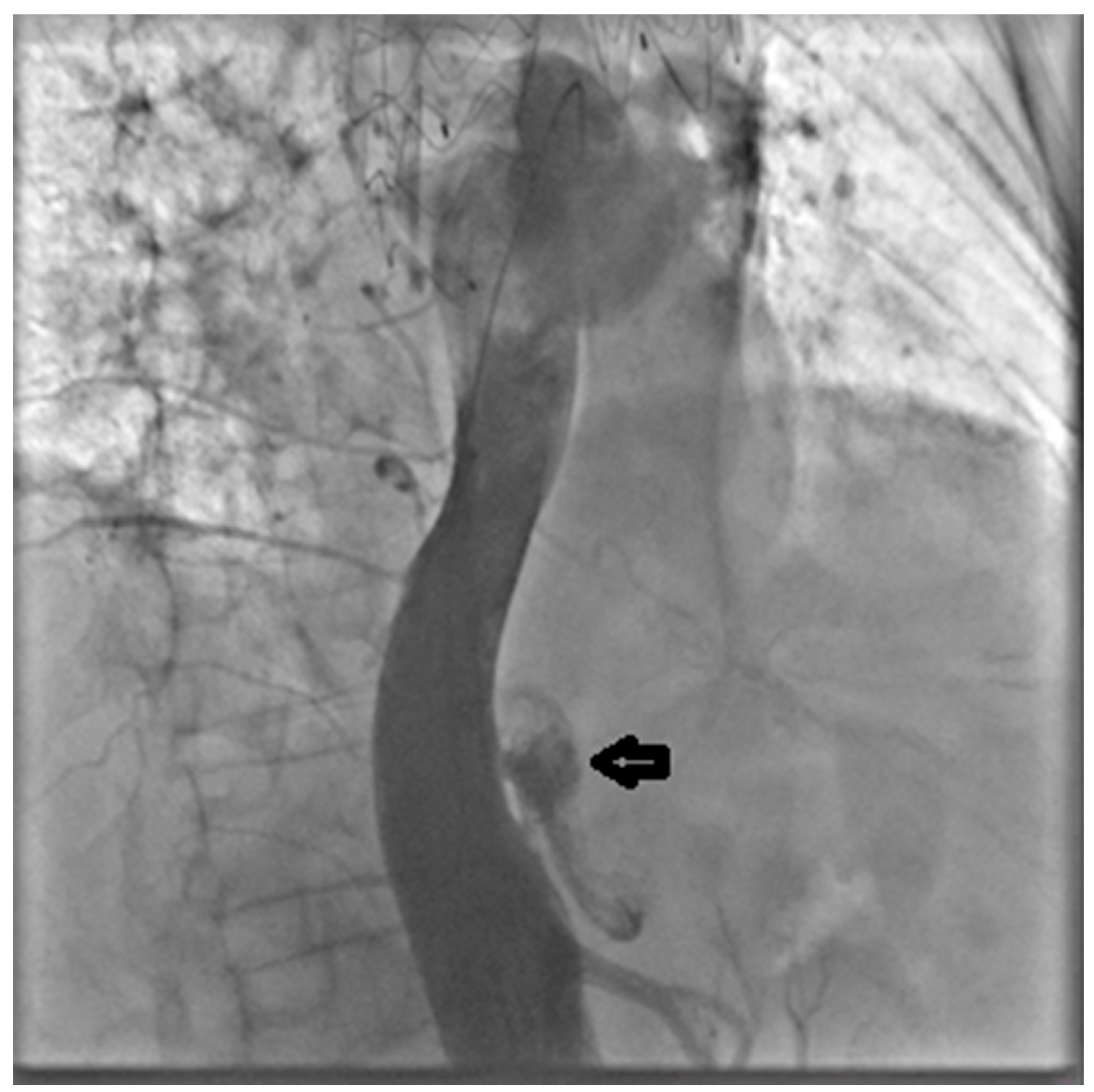Through the LCFA, a 6F pigtail catheter was advanced into the thoracoabdominal aorta. Intraoperative angiography confirmed substantial FL dilation and two distal re-entry tears beyond the prior TEVAR, with clear retrograde backflow (