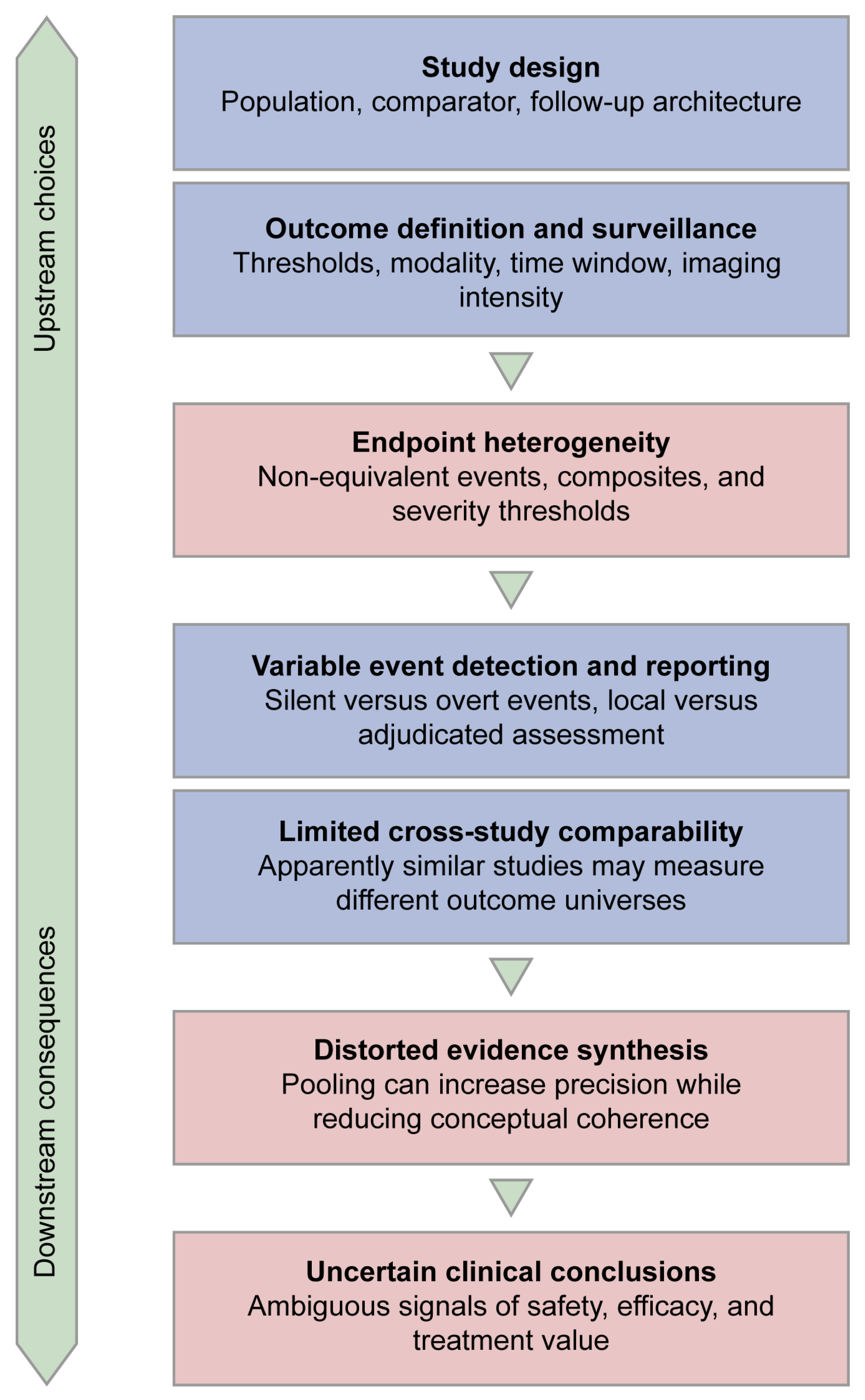 | Composite endpoint structure | The components included in a composite outcome | Stroke, myocardial infarction, and death combined in carotid intervention studies; reintervention added in some studies but not others | Similar composite rates may conceal different underlying event patterns |