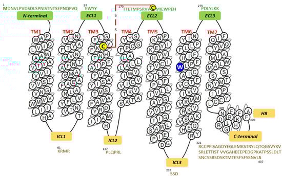Snake plot of the human NK-1 receptor depicting the amino acid sequences of the transmembrane (TM), in the color black; amino-terminal and extracellular loops (ECL), in the color green; intracellular loops, intracellular helix 8 (H8), and carboxy-terminal domains, in the color yellow. The numbers over the amino acid letters indicate their position within the entire receptor sequence from the N-terminal’s number 1 residue (Met). The red line depicts a disulfide bridge between Cys180 and Cys105 (in yellow). The W2616.48 residue in blue (superscript numbers correspond to Ballesteros and Weinstein numbering []) acts as a “molecular toggle” in the activation of GPCRs (G protein-coupled receptors) [,]. Image modified from the GPCRdb database [,].