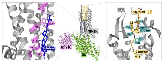 Cryo-electron microscopy studies revealed an active state of the NK-1 receptor complexed with Gq and Gs heterotrimeric proteins and bound to SP []. The occurrence of cholesterol molecules in the active form of the receptor (Figure 3, left panel) reinforces the reported importance of the organization of the plasma membrane with lipid rafts and caveolae where NK-1 receptors sit and recruit intracellular effectors after binding to SP []. The binding of SP to the receptor complexed with a heterotrimeric G protein indicates that the C-terminal region of the undecapeptide binds the receptor protein by interacting with its transmembrane core. In contrast, the N-terminal part extends towards the extracellular region (Figure 3, right panel) []. Additionally, the cryo-EM structural determination of the NK-1R-SP-G s/q70 complex showed that the N-terminal segment of SP establishes close contact with the extracellular loop 2 (ECL2) and the N-terminal portions of the receptor; the C-terminal region of SP comes into contacts with receptor residues N85 (in helix 2), N89 (in helix 2), H108 (in helix 3) and Y287 (in helix 7) through a network of hydrogen bonds []. The binding site of SP is different from the orthosteric pocket that NK-1R antagonists occupy, where the region of the receptor overlapped by the occupancy of SP and antagonists is scarce. For example, netupitant only shares a binding location with the amidated methionine at position 11 of the undecapeptide [].