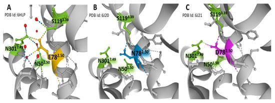Weak bonding interactions of different residues occupying the X2.50 position with neighboring S1193.39, N3017.49, and N501.50 in the structure of NK-1R. Panel (A) represents the position of E782.50 in a wild-type NK-1R bound to antagonist netupitant (PDB Id: 6HLP), defining the basal inactive state of NK-1 receptors. Panel (B) represents the position of N782.50 in a mutated NK-1R bound to antagonist aprepitant (PDB Id: 6J20) []. Panel (C) illustrates the situation of D782.50 in a mutated NK-1R attached to the antagonist aprepitant (PDB Id: 6J21) []. Receptor helices are depicted in gray. The figures are from the Protein Data Bank [] and were drawn with the Mol* free web-based software [].