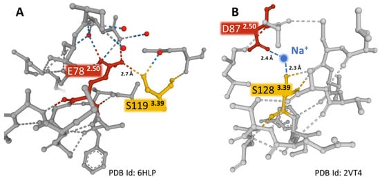 The weak interactions (dashed lines) between positions 2.50 and 3.39 in two different GPCRs. Panel (A) shows E782.50 directly interacting with S1193.39 in the NK-1R (PDB Id 6HLP). Panel (B) depicts the interaction of D872.50 with S1283.39 coordinated with a sodium ion in the turkey β-1 adrenergic receptor (PDB Id 2VT4) []. The sodium ion is blue, and the water molecules are red-colored spheres. The figures were obtained from the Protein Data Bank [] and drawn with the Mol* free web-based software [].