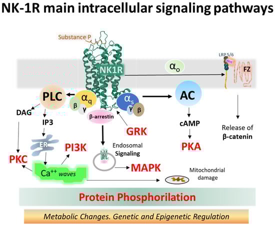 Intracellular NK-1R signaling pathways turned on after binding SP and activating different alpha subunits (Gq and Gs, mainly) and beta-gamma dimers of heterotrimeric G proteins (the structure of NK-1R in green is from the Protein Data Bank [], PDB Id. 2KS9) []. Abbreviations: AC (adenylyl cyclase), cAMP (cyclic 3′-5′ adenosine monophosphate), DAG (diacylglycerol), ER (endoplasmic reticulum), FZ (frizzled), GRK (G protein-coupled receptor kinase), IP3 (inositol 1,4,5 trisphosphate), LRP 5/6 (low-density lipoprotein receptor-related protein), MAPK (mitogen-activated protein kinase), NK-1R (neurokinin-1 receptor), PI3K (phosphatidylinositol 3-kinase), PKA (protein kinase A), PKC (protein kinase C), PLC (phospholipase C), and Wnt (wingless-related integration site) [,,,,,,,,,,].