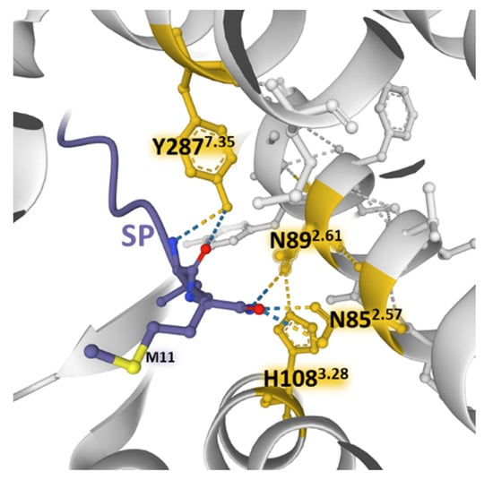 SP and neurokinin A (NKA) and neurokinin B (NKB) bind NK-1 receptors; however, differences in the charge distribution and amino acid composition of the peptides and their interaction with the anionic surface formed by acidic residues in extracellular loops 2 and 3 favor SP binding (higher affinity) over the other two tachykinins []. The structural resolution of NK-1 receptors bound to Gs and Gq proteins contributed to determining that the receptor similarly binds to both G proteins []. However, the binding to Gq is slightly favored and accords with the observed preference of Gq over Gs signaling []. Mutagenesis experiments and the structural dynamics analysis of ligand–receptor interactions [,,] showed that SP and its truncated form SP6-11 (lacking the N-terminal region of the undecapeptide) triggered calcium signaling with similar potency when bound to wild-type NK-1 receptors. However, NKA and SP6-11 induce a weaker cAMP accumulation response than SP. Additionally, experiments with NK-1R bearing conservative mutations of amino acids establishing hydrogen bonding nets deeper inside the pocket (N852.57, N892.61, H1083.28, and Y2877.35) with the C-terminal region of SP (Figure 8) did not affect the potency and maximal response of the undecapeptide. In contrast, truncated SP6-11-dependent responses significantly decreased [].