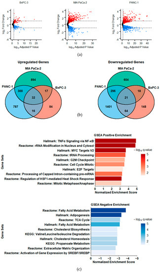 LXRs are key transcriptional regulators of metabolism genes. To determine the effects and mechanisms of action of the novel LXR ligand 3A4, we performed RNA sequencing (RNA-seq) analysis on three PDAC cell lines following 48 h treatments with DMSO (vehicle) or 3A4. Treatments with 3A4 resulted in more differentially expressed genes (DEGs) in PANC-1 and MIA PaCA-2 cells, which harbor KRAS mutations, as compared to KRAS-wildtype BxPC-3 cells (Figure 1a). Figure 1b Venn diagrams show an overlap of 53 DEGs between all three cell lines, suggesting significant cell line-specific effects, and a set of core genes which may mediate the inhibitory effects of 3A4. We next performed gene set enrichment analysis (GSEA) to investigate which pathways and gene networks were affected by ligand treatment (see Figure 1c and Supplementary Materials File S1). Among the positively enriched pathways, the highest enrichment scores across all cell lines were for gene sets involved in TNFα/NF-κB signaling and ribosome biogenesis. Stressful conditions and excess free FAs, such as the saturated FA palmitate, have been shown to activate NF-κB [30], and some of LXR’s anti-inflammatory effects have been attributed to repression of NF-κB target genes [31]. Increased expression of genes involved in TNFα signaling suggests possible disruption of cell survival and activation of apoptosis. Other positively enriched gene sets include those which function in MYC target activation and cell cycle checkpoints. MYC activation has been shown to increase cholesterol influx in tumors [32], and the observed upregulation may be caused by disrupted cholesterol synthesis, while ribosome biogenesis and effects on the cell cycle are well-documented responses to MYC signaling [33]; MYC activation also sensitizes cells to pro-apoptotic stimuli [34]. Ferroptosis and apoptosis genes were also positively enriched in MIA PaCa-2 cells, while those involved in apoptosis and necroptosis showed enrichment in PANC-1 cells. Negatively enriched pathways were predominately involved with lipid-associated processes, such as fatty acid synthesis and cholesterol homeostasis, but oxidative phosphorylation and the TCA cycle were also downregulated. These results demonstrate that metabolic pathways related to LXR activity—both directly and indirectly—are downregulated by 3A4 treatment. Transcriptomic data also provide insights into possible stress, immunomodulatory, cell death, and survival processes that are activated in response to metabolic perturbations caused by LXR inverse agonism.