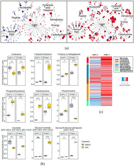 Treatment with 3A4 causes disruptions in cholesterol and phospholipid metabolites. (a) Pathway maps of statistically significant metabolites altered by 3A4 in BxPC-3 (left) and PANC-1 (right) cell lines. Red denotes upregulated metabolites and blue denotes downregulated metabolites (vs. DMSO). Node size correlates to magnitude of change. (b) Boxplots of differentially detected metabolites related to cholesterol and phospholipid metabolism. (c) Heatmap of log2-fold changes (vs. DMSO) for all lipid metabolites profiled. Side color bar indicates specific pathway. * p < 0.05, ** p < 0.01, *** p < 0.001, **** p < 0.0001, ns = nonsignificant.