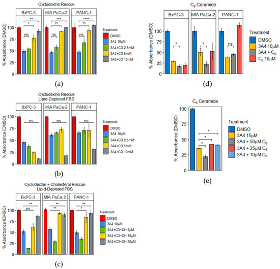 PDAC cells are sensitive to alterations in cholesterol and ceramide levels caused by 3A4. (a) 3A4 rescue assay with cyclodextrin. 10 µM treatments of 3A4 with concurrent treatments of cyclodextrin at stated concentrations. (b) 3A4 rescue assay with cyclodextrin in lipid-depleted serum. 10 µM treatments of 3A4 with concurrent treatments of cyclodextrin at stated concentrations. (c) 3A4 rescue assay with cyclodextrin and cholesterol in lipid-depleted serum. 10 µM treatments of 3A4 with concurrent treatments of cyclodextrin (10 mM) and cholesterol at stated concentrations. (d) C6-ceramide assays with 10 µM treatments of 3A4. (e) C6-ceramide assays with the PANC-1 cell line and 15 µM treatments of 3A4. * p < 0.05, ** p < 0.01, *** p < 0.001, **** p < 0.0001, ns = nonsignificant.