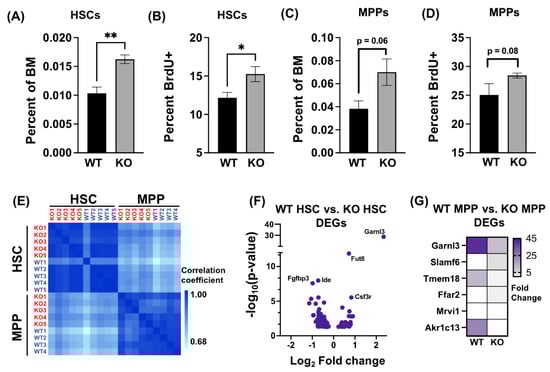 Proliferation Gene expression patterns in HSC and MPP from wild type and AHR KO mice. Bone marrow (BM) cells were isolated from wild type C57Bl/6 (WT) and global constitutive AHR knockout mice (KO). The percentage of (A) HSCs and (B) BrdU+ HSCs in WT and AHR KO mice was determined by flow cytometry (n = 5 mice per genotype). Percentage of (C) MPPs in the bone marrow and (D) percentage of BrdU+ MPPs were determined by flow cytometry. HSC were defined as Lin−CD135−CD117+Sca1+CD48−CD150+ cells and MPPs were defined as Lin−CD135−CD117+Sca1+CD48+CD150+/− cells. BrdU was delivered (i.p.) 2 h prior to bone marrow cell isolation. Asterisks denote p < 0.05 between genotype; Student’s t-test. (E–G) HSCs and MPPs from individual C57BL/6 (WT) mice and AHR KO mice were isolated by cell sorting (FACS) followed by RNA-Seq. HSCs were defined as Lin−CD135−CD117+Sca1+CD48−CD150+ cells, and MPPs were defined as Lin−CD135−CD117+Sca1+CD48+CD150+/− cells. The gating strategy for sorting is in Supplemental Figure S1. (E) Heatmap of the hierarchically clustered Euclidean distances between samples from the regularized log transformation of the normalized count data shows sample grouping by cell types. Darker shades of blue indicate sample distance and higher relatedness between libraries. (F) Volcano plot depicts the 103 differentially expressed genes (DEGs) identified in HSCs from WT and AHR KO mice. The complete list of HSC DEGs, with fold-change and p-value, can be found in Supplemental Table S3. (G) Heatmap of average normalized counts of the six genes that were differentially expressed in MPPs from WT and AHR KO mice. Gene expression by fold-change is shown. The complete list of MPP DEGs, with fold-change and p-value, can be found in Supplemental Table S4. The error bars indicate the SEM. Asterisks (*) denote p < 0.05 by Student’s t-test. Double asterisks (**) denote p < 0.01 by Student’s t-test.