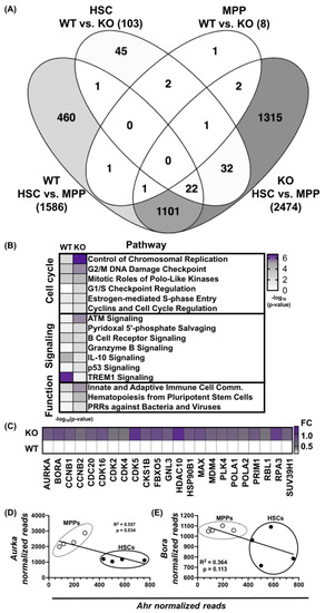 Absence of AHR alters cellular programming of hematopoietic stem and progenitor cells. The transcriptomes of phenotypically defined HSCs (Lin−CD135−CD117+Sca1+CD48−CD150+) and MPPs (Lin−CD135−CD117+Sca1+CD48+CD150+) cells were compared directly and across genotypes. (A) Four-way Venn diagram depicts the number of differentially expressed genes (DEGs) in the following comparisons: WT HSC vs. WT MPP, KO HSC vs. KO MPP, WT HSC vs. KO HSC, and WT MPP vs KO MPP. The number in parentheses indicates the total number of DEGs in each of these comparisons. The complete lists of DEGs from these comparisons are in Supplemental Tables S5 and S6. (B) Pathways identified as significantly different in the WT and KO intraphenotypic datasets (i.e., comparing DEGs in HSCs vs. MPPs across genotype). The heatmap denotes −log10(p value) in WT and KO intraphenotypic HSPC datasets (numerical data are in Supplemental Tables S7 and S8). (C) Heatmap depicts the log2 fold change of cell cycle related DEGs identified in the six cell cycle pathways identified (i.e., pathways in panel B). The fold-change and p-value for each DEG can be found in Supplemental Table S4. (D,E) Linear regression analysis was performed on the normalized reads of Aurka and Bora against Ahr. R2 and p-values are shown on each graph. Solid (HSC) and open (MPP) circles denote data from individual samples. The numerical information represented in each plot is Supplemental Tables S3 and S4.