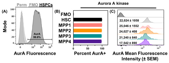 Aurora A kinase protein levels are similar in HSPC subsets. Bone marrow cells from C57Bl/6 mice (n = five) were isolated and stained for flow cytometry. (A) The dark grey histogram depicts AurA fluorescence in hematopoietic stem and progenitor cells. Fluorescence minus one (FMO) and permeabilization controls are shown in light grey solid and dotted grey lines, respectively. (B) Graph depicts the percentage of AurA+ HSPC subsets. Error bars denote SEM. Subsets were defined as follows: HSC (Lin−Sca1highCD117+CD34−CD135−CD48−CD150+), MPP1 (Lin−Sca1highCD117+CD34+CD135−CD48−CD150+), MPP2 (Lin−Sca1highCD117+CD34+CD135−CD48+CD150+), MPP3 (Lin−Sca1highCD117+CD34+CD135−CD48+CD150−), and MPP4 cells (Lin−Sca1highCD117+CD34+CD135+CD48−CD150−). (C) Histograms show the mean fluorescence intensity (MFI) of AurA in each HSPC subset. The numbers on the graph indicate the mean MFI (±SEM) of AurA in each indicated sub-population for all samples. There were five mice used, and bone marrow cells from individual mice were not pooled. A detailed gating strategy is provided in Supplemental Figure S2.