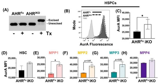 To determine if the absence of AHR alters AurA levels in hematopoietic stem and progenitor cells, AHRFx/Fx mice were crossed with CreERT2 mice, to generate AHRFx/FxCreERT2 mice [16]. Two weeks after tamoxifen treatment, Ahr was confirmed to be excised in bone marrow cells by PCR in these inducible AHR knockout (AHR iKO) mice, whereas Ahr was not excised in tamoxifen-treated AHRFx/Fx mice (Figure 4A). Inducible ablation of AHR resulted in a 20% increase in AurA protein in the hematopoietic stem and progenitor cells of AHR iKO mice, compared to hematopoietic stem and progenitor cells from control AHRFx/Fx mice (Figure 4B,C). Compared to AHRFx/Fx controls, AurA levels were generally higher among individual HSPC subsets from AHR iKO mice, but not statistically different in HSCs (Figure 4D). Within the MPP subsets, statistically higher levels of AurA were detected in MPP1 and MPP3 cells (Figure 4D–H) compared to AHRFx/Fx controls. These findings indicate that acute AHR deletion was sufficient to alter the level of AurA within hematopoietic stem and progenitor cells, with main effects occurring within MPPs.