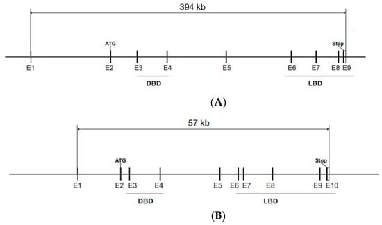 Genomic structure of the Esr1 and Esr2 genes. Start and stop codons are indicated and the exons encoding the DBD and LBD are underlined. (A) The Esr1 gene is localized on chromosome 10 and spans 394 kb and 9 exons (E1–E9) according to reference sequence NM_007956.5, Esr1 transcript variant 1. The start codon (ATG) is located in exon 2 and the stop codon in exon 9. (B) The Esr2 gene is localized on chromosome 12 and spans 57 kb and contains 10 exons (E1–E10) according to reference sequence NM_207707.1, Esr2 transcript variant 1. This variant produces a protein with an insertion of 18 amino acids that results in decreased ligand-binding affinity. Esr2 transcript variant 2, that lacks exon 7, is the variant that has the highest transcriptional activation activity.