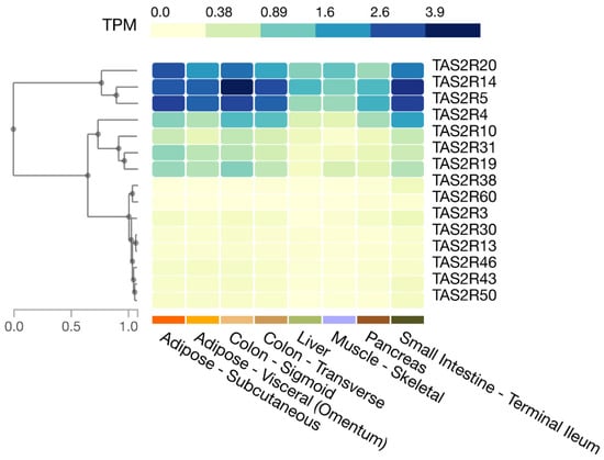 Expression of T2R genes in selected human tissues. Figure created in the GTEx portal (https://gtexportal.org/home/, accessed on 21 July 2023).