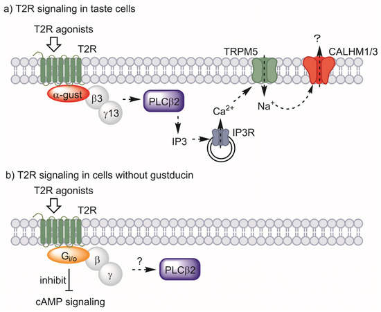 T2R signaling in taste cells (a) and proposed signaling for cells without gustducin (b). α-Gustducin (α-gust), beta-3 (β3), and gamma-13 (γ13) act as the major G-protein in taste signaling. Other G-proteins may have this role in other types of cells. Abbreviations: taste 2 receptor (T2R), α-gustducin (α-gust), beta-3 (β3), gamma-13 (γ13), phospholipase C β2 (PLCβ2), inositol 1,4,5-triphosphate (IP3), IP3 receptor (IP3R), transient receptor potential cation channel, subfamily M, member 5 (TRPM5), calcium homeostasis modulator 1/3 (CALHM1/3).