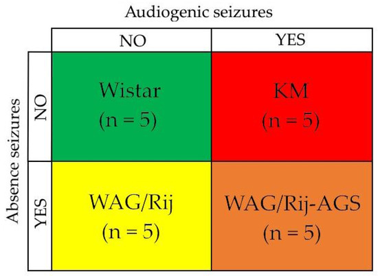 - Sarkisova, K.; van Luijtelaar, G. The WAG/Rij Strain: A Genetic Animal Model of Absence Epilepsy with Comorbidity of Depressiony. Prog. Neuropsychopharmacol. Biol. Psychiatry 2011, 35, 854–876. [Google Scholar] [CrossRef] [PubMed]