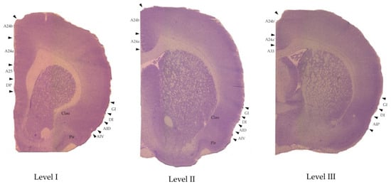 The regions of interest marked on examples of the Nissle-stained brain slices that were made for the morphological control. The anatomical levels are AP: +2.39–2.51 (level I), +0.17–0.19 (level II), and −0.25–0.29 (level III) according to [52,53]. For abbreviations see Table 1.