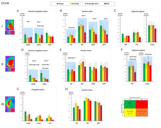 Comparison of the D1 dopamine receptors’ (D1DR) regional binding densities in the prefrontal cortex and adjacent regions between the four experimental groups (see Section 2, Section 2.1 and Section 2.6; the experimental design is shown in the lower right corner; the color codes for the rat groups are given above the charts). The values are given as mean ± SEM, in pmol/g of tissue (y axis). The lines of the charts correspond to anatomical levels which are AP: +2.39–2.51 (level I—first line of charts top down), +0.17–0.19 (level II—the second line), and −0.25–0.29 (level III—the last line) according to [52,53]. Next to level numbers are examples of brain slices from the corresponding levels, processed with a thermal imager. Graphs (A,D,G) show D1DR density for the anterior cingulate and midcingulate cortices, graphs (B,E,H)—insular cortex and graphs (C,F)—show D1DR density in regions adjacent to the prefrontal cortex. The anatomical abbreviations (x axis) are as follows: GI—the granular insular cortex; DI—the dysgranular insular cortex; AID—the dorsal agranular insular cortex; AIV—the ventral agranular insular cortex; DP—the dorsal peduncular cortex; Pir—the piriform cortex; Clau—Claustrum. Differences are denoted by * for p ≤ 0.05, **—for p ≤ 0.01 and “tend” for tendency (0.05 < p < 0.10). The “AGS” sign marks the effect of the audiogenic seizures’ presence, and the “Abs” sign marks the effect of the absence epilepsy. The charts for the areas with significant differences in D1DR densities are marked by blue shading. The tritium-labeled standards (microscales, Amersham, UK) are shown below the brain images and refer to the following values: 0.043 nCi/mg; 0.099 nCi/mg; 0.179 nCi/mg; 0.333 nCi/mg; 0.598 nCi/mg; 1.374 nCi/mg; 2.01 nCi/mg, from left to right, respectively. For more information, see the Supplementary Table S1A–F.