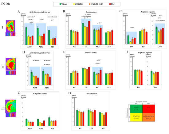 Comparison of the D2 dopamine receptors’ (D2DR) regional binding densities in the prefrontal cortex and adjacent regions between the four experimental groups (see Section 2, Section 2.1 and Section 2.6; the experimental design is shown in the lower right corner; the color codes for the rat groups are given above the charts). The values are given as mean ± SEM, in pmol/g of tissue (y axis). The lines of the charts correspond to anatomical levels which are AP: +2.39–2.51 (level I—first line of charts top down), +0.17–0.19 (level II—the second line), and −0.25–0.29 (level III—the last line) according to [52,53]. Next to level numbers are examples of brain slices from the corresponding levels after processing with the effect of a thermal imager. Graphs (A,D,G) show D2DR density for the anterior cingulate and midcingulate cortices, graphs (B,E,H) show insular cortex, and graphs (C,F) show D2DR density in some regions adjacent to prefrontal cortex. The anatomical abbreviations (x axis) are as follows: GI—the granular insular cortex; DI—the dysgranular insular cortex; AID—the dorsal agranular insular cortex; AIV—the ventral agranular insular cortex; DP—the dorsal peduncular cortex; Pir—the piriform cortex; Clau—Claustrum. Differences are denoted by * for p ≤ 0.05, **—for p ≤ 0.01 and “tend” for tendency (0.05 < p < 0.10). The “AGS” sign marks the effect of the audiogenic seizures presence, and the “Abs” sign marks the effect of the absence epilepsy. The charts for the areas with significant differences in D2DR densities are marked by blue shading. The tritium-labeled standards (microscales, Amersham, UK) are shown below the brain images and refer to the following values: 0.043 nCi/mg; 0.099 nCi/mg; 0.179 nCi/mg; 0.333 nCi/mg; 0.598 nCi/mg; 1.374 nCi/mg; 2.01 nCi/mg, from left to right, respectively. For more information, see the Supplementary Table S2A–F.