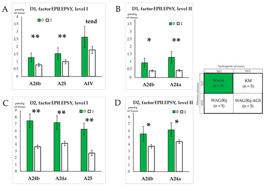 Effects of genetic generalized epilepsy in D1DR and D2DR binding densities. Graphs (A,B) show structures for which the D1DR density was significantly different for rats with epilepsy on levels I and II, respectively. Graphs (C,D) show structures for which the D2DR density was significantly different for rats with epilepsy on level I and II, respectively. “0” = no epilepsy, “1”—the presence of epilepsy. The anatomical abbreviations (x axis) are as follows: AIV—the ventral agranular insular cortex. Differences are denoted by * for p ≤ 0.05, **—for p ≤ 0.01 and “tend” for tendency (0.05 < p < 0.10).