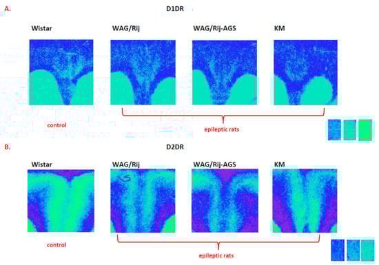 Previously, we have made comparative studies with the same design for several electrophysiological, behavioral, and neurochemical parameters [31,35,36,37,38,39]. In particular, we demonstrated that D1DR and D2DR binding densities display epilepsy type-specific changes in the brain’s striatal complex, as well as epilepsy type-nonspecific alterations [40].