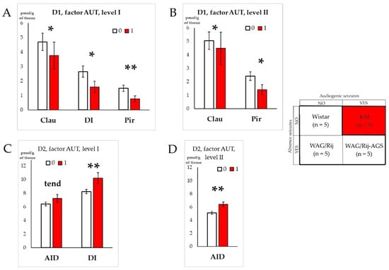 Impacts of autism spectrum disorder-like phenotype on D1DR and D2DR binding densities. Graphs (A,B) show structures for which the D1DR density significantly differed between rats with autism spectrum disorder-like phenotype (red bars) and “non-autistic” rats (pooled group, white bars), on anatomical level I and II, respectively. Graphs (C,D) show structures for which the D2DR density significantly differed between the rats with autism spectrum disorder-like phenotype (red bars) and “non-autistic” ones (white bars), on anatomical level I and II, respectively. “0” = “non-autistic” social traits, “1”—ASD-like phenotype. The anatomical abbreviations (x axis) are as follows: DI—the dysgranular insular cortex; AID—the dorsal agranular insular cortex; Pir—the piriform cortex; Clau—Claustrum. Differences are denoted by * for p ≤ 0.05, **—for p ≤ 0.01 and “tend” for tendency (0.05 < p < 0.10).