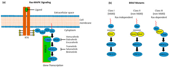 (a) Ras/MAPK signaling. Binding to a suitable ligand leads to dimerization and autophosphorylation of the RTK. Docking and adapter proteins (Shc, Grb2, and SOS) bind to activated RTK and recruit farnesylated Ras (red membrane anchor line = farnesyl residue). Induced Ras activates RAF, which, in turn, activates/phosphorylates MEK1/2, followed by the activation/phosphorylation of ERK1/2, which is supported by scaffold proteins such as KSR1/2. BRAF inhibitors (vemurafenib, dabrafenib, and encorafenib) and MEK inhibitors (trametinib, selumetinib, and inimetinib) interrupt oncogenic Ras/MAPK signaling; (b) classes of BRAF mutations. Class I: BRAFV600 mutant monomers; kinase activity independent from Ras. Class II: non-V600 mutant homodimers; kinase activity independent from Ras. Class III: non-V600 mutants forming heterodimers with CRAF; inactive BRAF kinase; CRAF activation dependent on Ras via mutant BRAF.