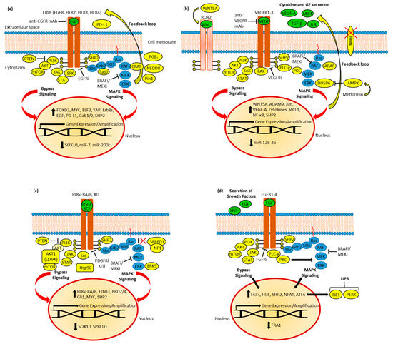 (a) EGFR in BRAF inhibitor (BRAFi) resistance. Resistant cells established feedback loops and bypassed signaling via AKT, JAK/STAT, and SFK signaling, accompanied by deregulation of transcription factors (SOX10, FOXD3, MYC, ELF3, and YAP) and miRNAs. Upregulated CRAF and PD-L1 were identified. Moreover, active SHP2, Pin1, and NEDD8 as well as upregulated PGE2 synthesis promote resistance. (b) VEGFR in BRAFi resistance. The feedback loop leads to increased secretion of cytokines and growth factors (GF). ARAF and SHP2, as well as metformin-induced AMPK activation (followed by DUSP6 suppression), contribute to MAPK reactivation. TRAIL apoptosis signaling is blocked in resistant cells. Bypass signaling includes AKT, STAT, and FAK; VEGF-A and cytokine production; and Wnt-activated ROR2 RTK. Resistance was accompanied by the induction of c-Jun transcription factor and the downregulation of miR-126-3p; the latter caused the upregulation of ADAM9. (c) PDGFR and KIT in BRAFi resistance. Resistant cells established feedback loops and bypassed MAPK inhibition via AKT, JAK/STAT, and Src signaling, accompanied by deregulation of transcription factors (SOX10, MYC, and Gli1) and BRD2/4. Mutant AKT1 overcomes PTEN-based AKT inhibition, while suppressed SPRED1 and induced ERK5 lead to MAPK reactivation. RTK (PDGFR and ErbB3) expression is upregulated. Active SHP2 and Hsp90 promote resistance. (d) FGFR in BRAFi resistance and BRAF mutant tumor metastasis. Feedback leads to increased expression and secretion of growth factors. SHP2 and PKC-mediated MAPK signaling contribute to MAPK reactivation. Resistance was accompanied by suppression of the FRA1 transcription factor and induction of NFAT and ATF6, the latter of which caused upregulation of UPR by activation of IRE1 and PERK.