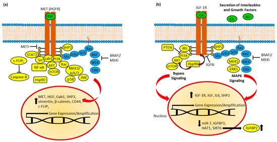 (a) MET in BRAFi resistance. Resistant cells established feedback loops and bypassed MAPK inhibition via AKT, STAT3, Rac-MEK, and Src signaling. Active SHP2 and Hsp90 promotes resistance, while c-FLIPL suppresses caspase-8-dependent apoptosis. Upregulated expression of HGF, MET, and Gab1 promote oncogenic signaling. EMT induction (upregulation of vimentin, β-catenin, and CD44) was observed. (b) IGF-1R in BRAFi resistance. Feedback leads to increased expression and secretion of IGFs and IL6, and upregulation of IGF-1R expression. SHP2 and induced MEK5/ERK5 signaling contribute to MAPK reactivation. PI3K/AKT signaling is upregulated and depends on IRS. Hsp90 stabilizes AKT and IGF-1R. Resistance was accompanied by suppression of miR-7, HAT1, and SIRT6; the latter caused upregulation of IGFBP2.