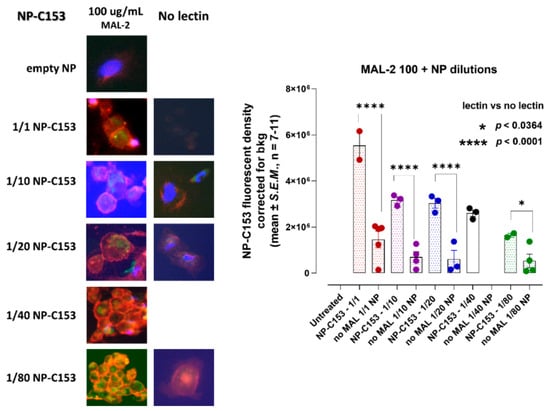 The data depicted in Figure 1 showed that at increased concentrations, the addition of lectins MAL-2, SNA-1, PNA, and WGA in combination with 350 kDa C153-FA–DABA–SMA copolymer increased the internalization of the copolymer. The half maximal effective concentration (EC50) of lectins for MAL-2 was 35.88 µg/mL, 3.05 µg/mL for SNA-1, 7.88 µg/mL for PNA, and 0.89 µg/mL for WGA to induce cellular internalization into the cytoplasm. When the cells were treated with 100 μg/mL of MAL-2, the internalization of the 350 kDa nanoparticle significantly increased at all of the indicated dilutions (Figure 2). With the highest concentration of the nanoparticle, there was an increased internalization in the presence of MAL-2, with a consistent lower internalization and increased dilutions of the nanoparticle with MAL-2.