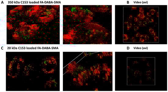 To further support these observations, live cell microscopy and video expression of C153-loaded FA–DABA–SMA copolymers and cell membranes were assessed using an inverted Leica DMi8 fluorescent microscope equipped with a photron fastcam SA-Z high-speed camera (Figure 5). Live PANC-1 cells were cultured on a 35 mm Mattek dish, No. 1.5 gridded coverslip at 14 mm glass diameter in culture media containing 10% fetal calf serum for 24 h. Live cells were washed with 1× PBS and then incubated with a 1:1000 dilution of Invitrogen CellMaskTM Deep Red plasma membrane stain in 1× PBS solution at 37 °C for 7 min, followed by three washes with 1× PBS. The cells were treated with 1/80 dilution of 20 kDa and 350 kDa C153-loaded FA–DABA–SMA. After a 1 h incubation, the cells were washed three times with 1× PBS. The colocalization of Invitrogen CellMaskTM Deep Red plasma membrane stain (red) and C-153-loaded FA–DABA–SMA (green) was captured at one-second intervals and recorded as a video. Live cell videos of PANC-1 are given in Supplementary Video S1 for Figure 5B,D.