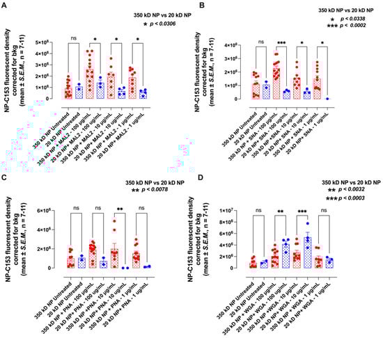 The efficacy of the internalization of the 350 kDa and 20 kDa C153-loaded FA–DABA–SMA NP into PANC-1 cells following treatment with (A) MAL2, (B) SNA-1, (C) PNA, and (D) WGA lectins at the indicated concentrations. PANC-1 cells were plated at a density of 100,000 to 200,00 cells/mL on glass coverslips in 24-well plates. Cells were treated with 200 µL of lectin at concentrations of 100 g/mL, 10 g/mL, and 1 g/mL and incubated for 35 min. Cells were then washed with 1× PBS and incubated in CellMask™ Deep Red Plasma membrane stain and diluted to a concentration of 1:1000 in 1× PBS for 7 min. Cells were washed 3 times with 1× PBS and then treated with 170 L of 20 kDa and 350 kDa C153-loaded FA–DABA–SMA per well and incubated for 1 h. Cells were subsequently washed with 1× PBS and mounted onto glass slides with Fluoroshield Mounting Medium. The images were visualized using a ZEISS Axio Imager M2 fluorescent microscope (Carl Zeiss AG, Oberkochen, Germany) at 40× magnification. The results are depicted as scatter bar graphs of the mean fluorescent density corrected for background luminescence ± SEM of 3 independent experiments performed in triplicates. The results of the treatments with 20 kDa and 350 kDa copolymers were compared using the one-way ANOVA Fisher (LSD) test comparisons with 95% confidence, indicated by asterisks for statistical significance. ns: not significant.