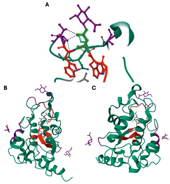 Graphical representation to visualize the structure of the folic acid receptor (FR). Green structures depict amino acid chains for FR and N-acetyl-D-glucosamine (GlcNAc) sites are shown as purple projections from the amino acid chains. The folic acid binding pocket is labeled in red, and folic acid is labeled in grey. (A) The N139 glycosylation site, specifically with the bright green region highlighting the connection of this site to the binding pocket. At the same time, image (B) shows the full structure of the folic acid receptor with the binding pocket exposed, and image (C) shows the structure rotated 180° relative to (B). Images adapted from the RCSB Protein Data Bank [https://doi.org/10.2210/pdb4LRH/pdb, accessed on 15 August 2024] are distributed under a CC0 1.0 Universal (CC0 1.0) Public Domain Dedication license [https://creativecommons.org/publicdomain/zero/1.0/, accessed on 15 August 2024] [].