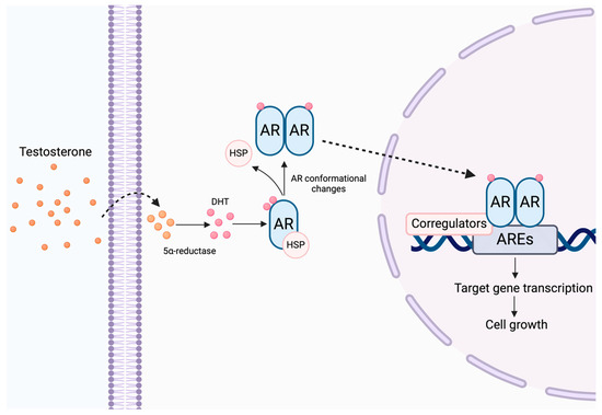 AR pathway. Free androgens in the bloodstream can diffuse freely across the plasma membrane of cells. Within the cell cytoplasm, testosterone is converted to dihydrotestosterone (DHT) by the action of the enzyme 5α-reductase. This conversion is essential because DHT has an increased affinity for AR. Within the cell cytoplasm, the AR remains inactive and bound to chaperone proteins, such as HSPs. However, when the androgen binds to the AR, it undergoes conformational changes that allow dissociation from chaperone proteins and subsequent activation. Once active, the androgen-bound AR forms a homodimer with another complex. This complex then translocates to the cell nucleus, where it binds to the AREs, located in the promoters of various target genes. The binding of the AR to the AREs allows the recruitment of coactivator proteins that modulate the transcription of genes involved in cell proliferation, differentiation, and apoptosis [14,15,16,26]; created with Biorender.com.
