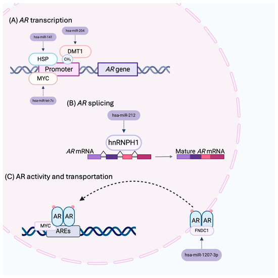 Indirect regulatory mechanisms of miRNAs on the AR gene. (A) Some miRNAs regulate AR regulators, such as HSP and MYC, which act as transcription factors for AR expression, or DMT1, which is responsible for methylating the AR promoter, thereby regulating its expression. (B) Furthermore, it has been observed that AR can be regulated by miRNAs that control master genes in AR splicing, such as hnRNPH1, or genes that act as cofactors (MYC) or transporters (FNDC1) (C), thus affecting the overall activity of AR; created with Biorender.com.
