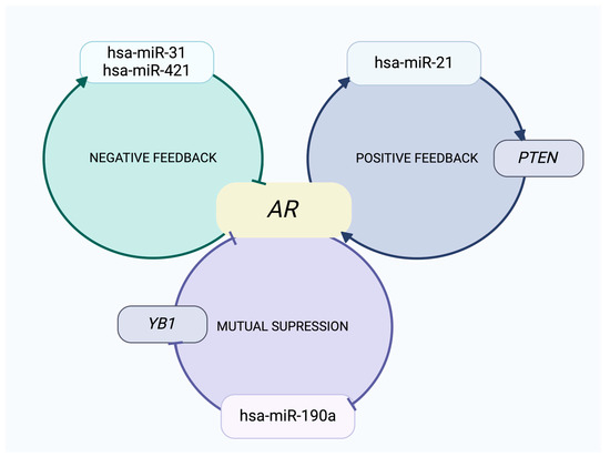It has been reported [124] that the regulatory role of AR in modulating the expression of several miRNAs, which reciprocally influence AR expression. Particularly, hsa-miR-21 is notably affected by AR, as AR facilitates its transcription, while this miRNA promotes AR expression by directly regulating PTEN (phosphatase and tensin homolog deleted on Chromosome 10) through a positive feedback loop [109,134]. Conversely, AR increases the expression of hsa-miR-31 and hsa-miR-421, leading to the inhibition of AR expression via a negative feedback mechanism [111,121,135]. Furthermore, reciprocal repressions have been described [124]; the expression of hsa-miR-190a is repressed by AR; and in turn, the expression of AR is repressed by this miRNA by regulating the activity of YB1 (Y box-binding protein 1), a coactivator of AR [136,137] (Figure 3).