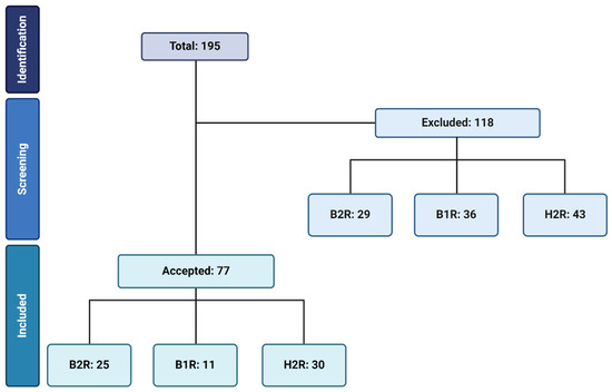 This flowchart illustrates the search strategy applied to find possible interactions between kinin receptors (B1R and B2R) and histamine H2 receptors. Horizontally oriented boxes represent the number of manuscripts reviewed at each stage.