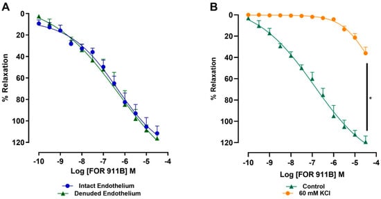Concentration–response curve for the vasorelaxant effect induced by FOR911B in isolated rat aortic rings, with and without endothelium, pre-contracted with Phe (0.1 μM) (A) and without endothelium, pre-contracted with Phe and KCl (60 mM) (B). Values are expressed as mean ± S.E.M. (n = 6). * p < 0.05 vs. Control, Student’s t-test.