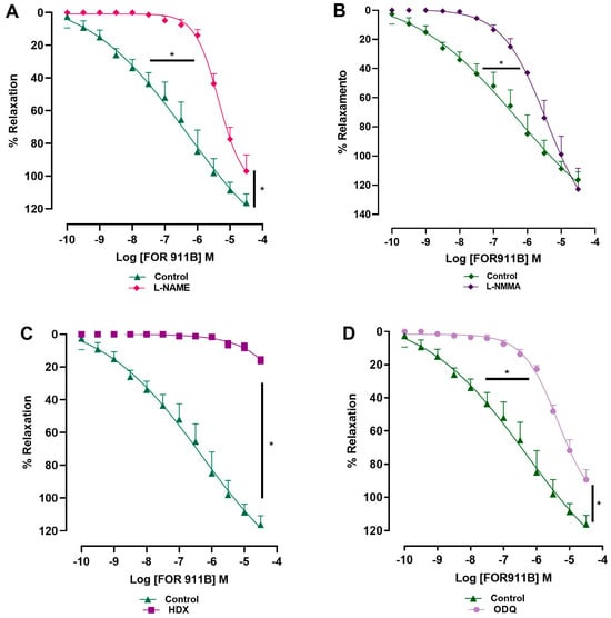 Concentration–response curve for the vasorelaxant effect induced by FOR911B in isolated endothelium-denuded rat aortic rings pre-contracted with Phe (0.1 μM) in the presence of L-NAME (100 μM) (A), L- NMMA (100 μM) (B), HDX (30 μM (C), and ODQ (1 μM) (D). Values are expressed as mean ± S.E.M. (n = 6). * p < 0.05 vs. Control, Student’s t-test.