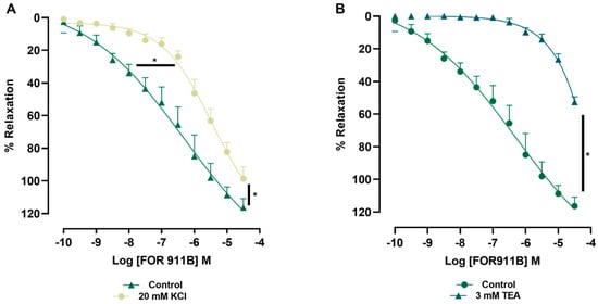 Concentration–response curve for the vasorelaxant effect induced by FOR911B in isolated endothelium-denuded rat aortic rings pre-contracted with Phe in the presence of 20 mM KCl (A) and 3 mM TEA (B). Values are expressed as mean ± S.E.M. (n = 6). * p < 0.05 vs. Control, Student’s t-test.