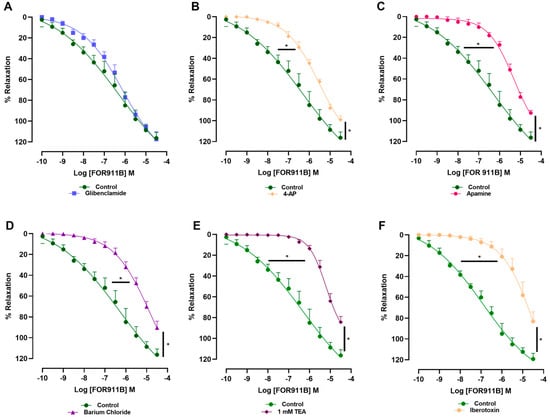Concentration–response curve for the vasorelaxant effect induced by FOR911B in isolated endothelium-denuded rat aortic rings pre-contracted with Phe in the presence of Glibenclamide (10 μM) (A), 4-AP (0.3 mM) (B), Apamine (100 nM) (C), Barium chloride (100 μM) (D), TEA (1 mM) (E), and Iberotoxin (20 nM) (F). Values are expressed as mean ± S.E.M. (n = 6). * p < 0.05 vs. Control, Student’s t-test.