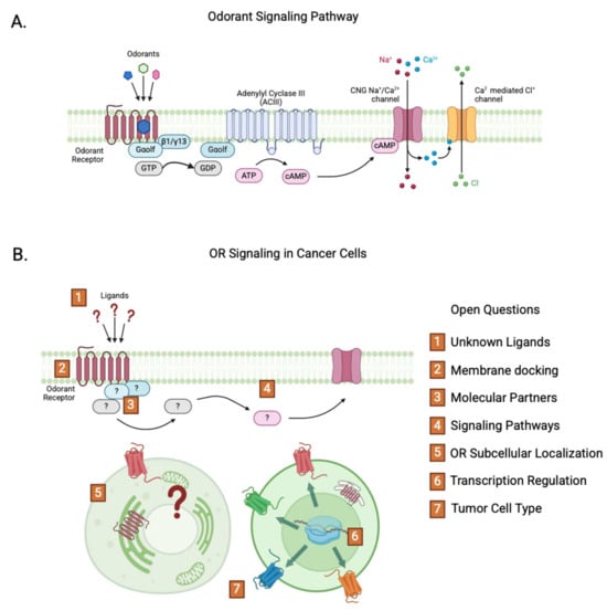 Schematic comparison between the OR signaling pathway in olfactory sensory neurons and in cancer cells. (A) Odorant binding induces a conformational change in the OR structure, leading to the dissociation of GDP from the Gαolf subunit and subsequent GTP binding to Gαolf. Gαolf-GTP activates adenylyl cyclase III (AC3), which increases the intracellular cAMP concentration. Consequently, cyclic nucleotide-gated (CNG) channels are opened and cation concentrations, including calcium ions (Ca2+), transiently increase within the OSN. This influx of cations depolarizes the ciliary membrane and activates calcium-activated chloride channels, enabling chloride ions to efflux from the cell and further amplify the membrane depolarization, thus enhancing the odorant signaling. (B) Open questions regarding OR signaling in cancer cells: (1) while ORs in OSNs can be activated by a wide range of odorants with diverse chemical structures, the endogenous activators of ORs in cancer cells remain unidentified; (2) it is not clear if ORs are targeted to the cell membrane in cancer cells; (3) the specific G protein subunits involved in OR signaling in cancer cells remain unknown; (4) although in vitro studies suggest that ORs activate pathways such as ERK, MAPK, AKT, and PI3K, their precise signaling mechanisms in cancer cells and tissues in vivo are not understood.; (5) it is unclear whether ORs have specific intracellular functions or are localized within particular cellular organelles; (6) multiple ORs have been found to be co-expressed in vitro in cancer cell lines. Although this may suggest that this co-expression occurs within the same individual cancer cells, in contrast to the one neuron-one receptor rule in the olfactory system, this remains uncertain due to the lack of data from single-cell RNA sequencing or single-molecule RNA-FISH. Therefore, the mechanisms governing OR gene transcriptional regulation in cancer cells need to be determined at single-cell resolution; (7) some tumors exhibit significant cellular heterogeneity, but the expression patterns of ORs across different tumor cell subtypes are unclear. Most studies analyze bulk tumor samples, highlighting the need for single-cell approaches to resolve this complexity.