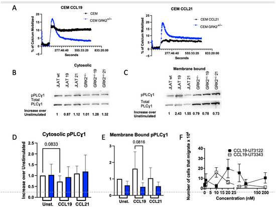 Signaling through CCR7 mobilizes Ca2+, which can activate Rac signaling upstream of cell migration [62]. We have shown that CCL21 promotes activation of phospholipase Cγ1 (PLCγ1) via phosphorylation, which mobilizes Ca2+ and is required for chemotaxis of T cells to CCL21 [54]. Since GRK2 promotes migration of T cells to CCL21 (Figure 7), we questioned whether signaling through PLCγ1 is regulated by GRK2 downstream of CCL21 activation of CCR7. To this end, we compared Ca2+ mobilization in the CEM and CEM-GRK2+/− T cells. We found that GRK2 is required to maintain CCL19-induced Ca2+ mobilization levels. In contrast, during CCL21-induced Ca2+ mobilization, GRK2 expression is required for peak Ca2+ release, but not sustained Ca2+ mobilization. We used Western blots to quantify phosphorylated PLCγ1 (pPLCγ1), which was normalized to total PLCγ1 in JLAT-WT-CCR7 and JLAT-WT-CCR7-GRK2+/− cells that were stimulated with CCL19 or CCL21. Levels of activated cytosolic PLCγ1 were limited by GRK2 expression independent of ligand. In contrast, levels of membrane-bound activated PLCγ1 were enhanced by GRK2, with levels of membrane-bound PLCγ1 approaching significance downstream of CCL19 (Figure 8). To confirm that CCL19-mediated migration was not regulated by PLCγ1, we used the pan PLC inhibitor U73122 (Figure 8F) and found that migration via CCL19 is not dependent upon activation of PLC.