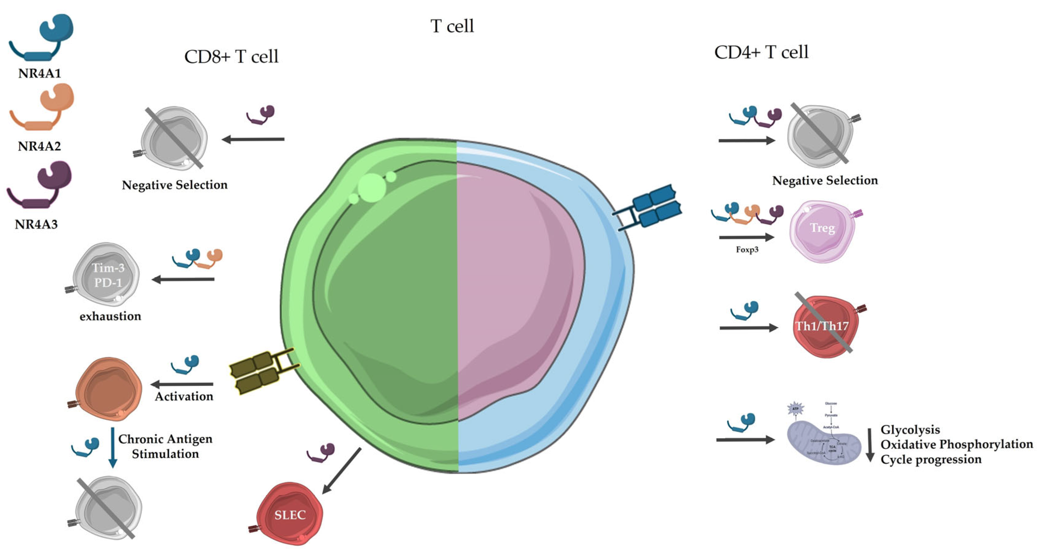 - Nielsen, H.V.; Yang, L.; Mueller, J.L.; Ritter, A.J.; Hiwa, R.; Proekt, I.; Rackaityte, E.; Aylard, D.; Gupta, M.; Scharer, C.D.; et al. Nr4a1 and Nr4a3 Redundantly Control Clonal Deletion and Contribute to an Anergy-like Transcriptome in Auto-Reactive Thymocytes to Impose Tolerance in Mice. Nat. Commun. 2025, 16, 784. [Google Scholar] [CrossRef]